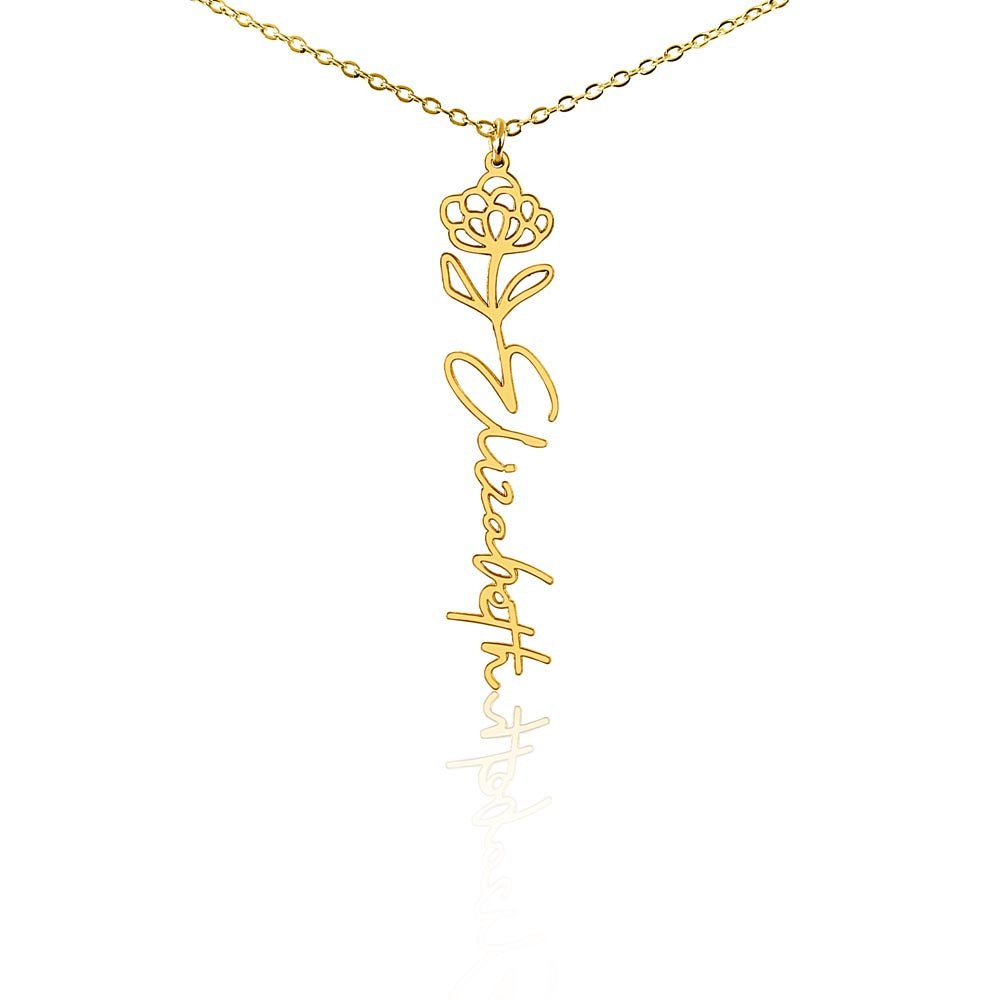 The FloraLuxe Spark Name Necklace transforms your chosen name into a delicate cursive masterpiece, paired with your birth flower for a truly personal touch. Handcrafted in the USA with precision cutting technology, this custom piece celebrates the unique story that only you can tell.